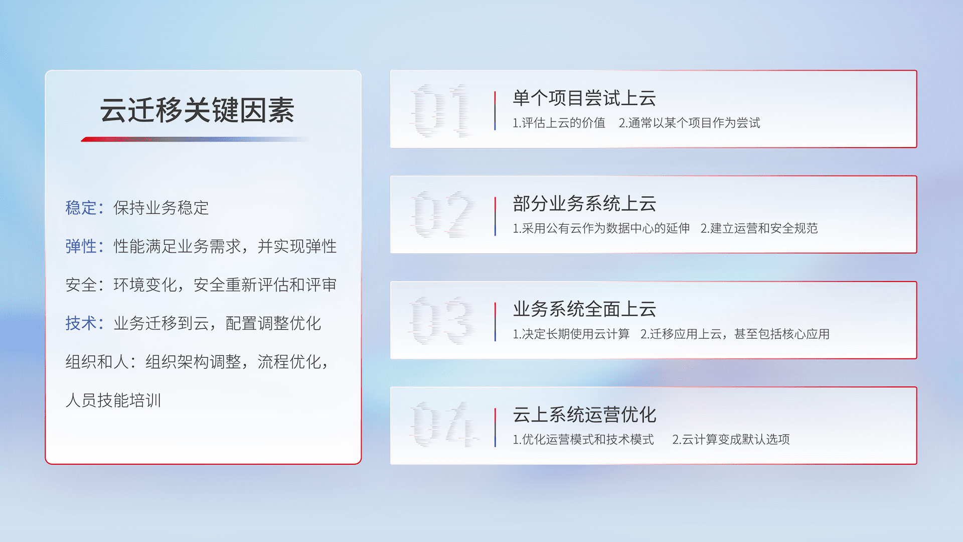 结合实际业务,,,,从规划设计、、、、云平台选型、、云原生改造、、、数据迁移、、集成交付,,,迁移全过程为客户识别最佳上云路径,,,,做好风险识别管理,,设计网络架构、、、身份权限、、安全审计合规、、操作审计、、日志审计、、、、监控告警策略、、、多站点容灾设计等,,对云上基础设施进行整体规划,,提升IT治理水平,,,,以满足弹性、、、、高可用、、、高性能的需求。。。。