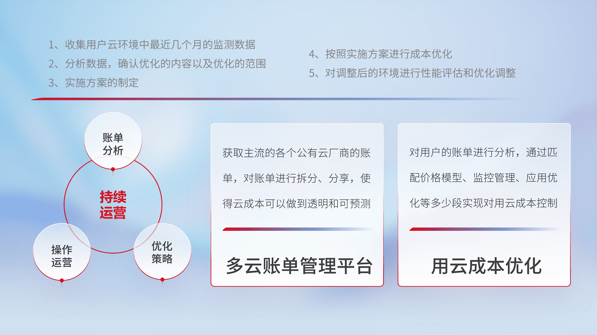 通过多云纳管,,,,以统一的资源数据模型把客户的云资源进行抽象和封装,,进而实现对多云资源的统一操作,,,,保障云资源管理的可靠性、、稳定性与可用性。。。。量身定制化运维内容,,,配置、、开发运维、、补丁管理、、、备份、、监控、、、认证和访问管理、、、、审计和日常巡检等,,保障在用云过程中的可靠度,,稳定度以及高可用率。。。。